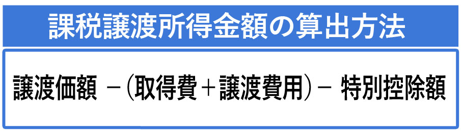 まずは、課税の対象となる譲渡所得金額を算出します。譲渡所得金額は、下記の計算方法で算出できます。