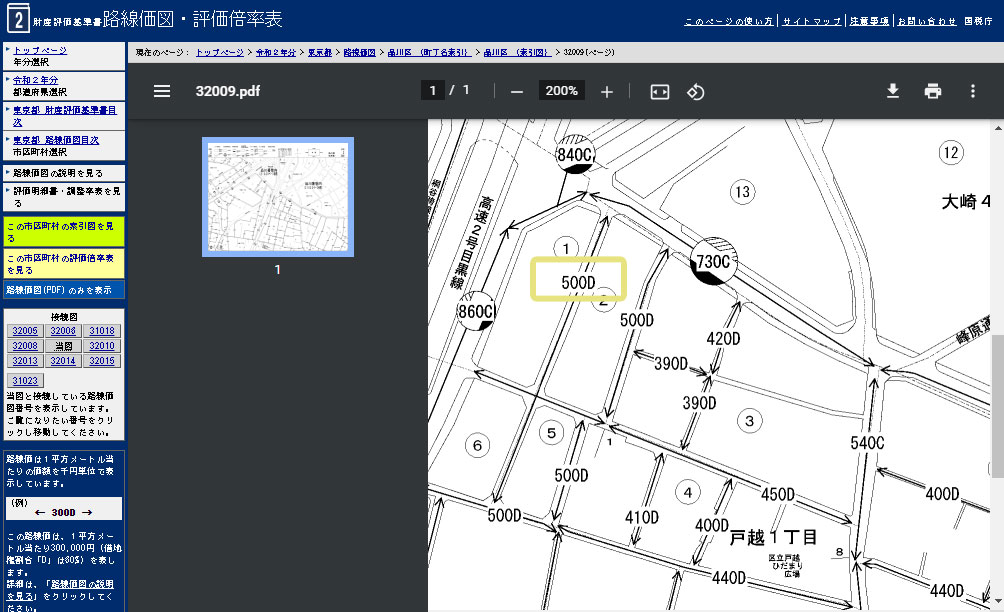 路線価は、1㎡あたり千円単位で記入されています。上記の黄色に囲ってある部分「500D」は1㎡あたりの路線価が500,000円となります。(アルファベットを除いて算出します)