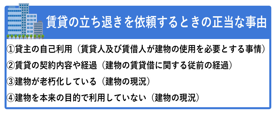 賃貸の立ち退きを依頼するときの正当事由とは、貸主が借主に住居の明け渡しを求められる常識的な理由を指します。