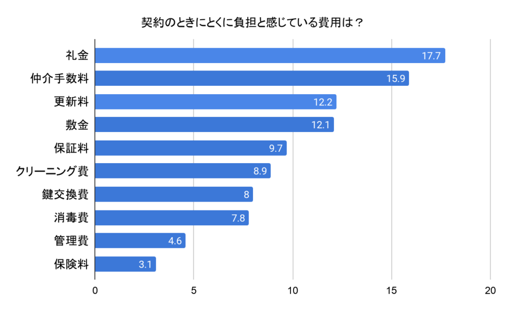 2019年に株式会社アルティメット総研が実施した「部屋探しに関するアンケート」では、契約のときに負担と感じている費用として礼金が一位となっています。