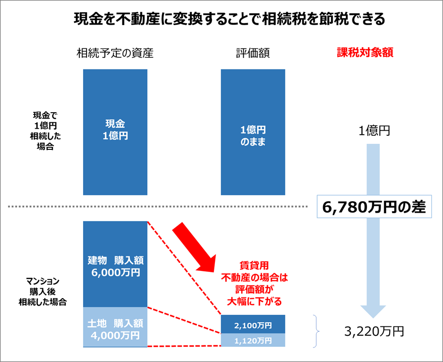 以下のように、1億円を相続する場合、不動産に変換することで、相続税の計算の対象となる課税対象額は、6,780万円もの差が生まれます。