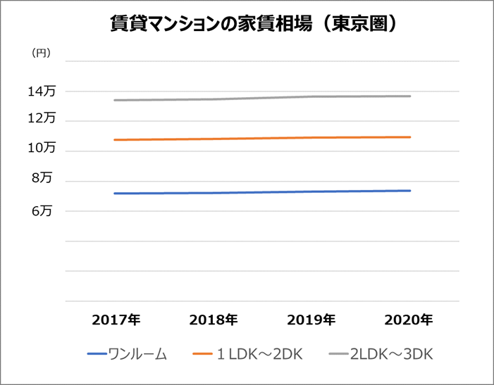 公益財団法人不動産流通推進センターの「2020不動産業統計集」によると、東京圏の賃貸マンションの家賃相場は、以下のグラフのように、ほぼ変動がありません。