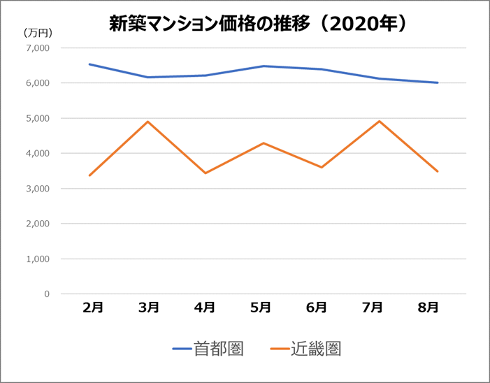 しかし、マンションの場合は、景気変動に強く、短期間で価値が暴落するという例はあまり見られません。不動産経済研究所の発表データを見ても、以下のように、マンションの販売価格は、2月以降もほぼ横ばいで、大きな影響を受けていないように見えます。