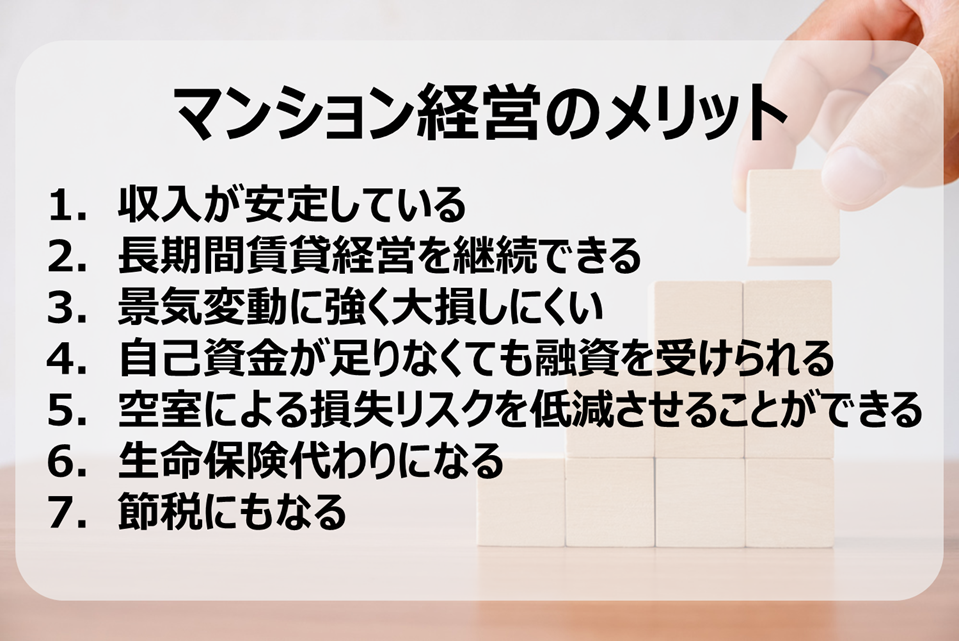 この章では、冒頭でもご紹介した、以下の7つのマンション経営のメリットについて、詳しく解説をしていきます。