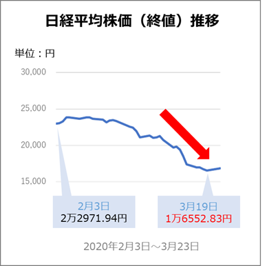 例えば、2020年のコロナショックで、日経平均株価は以下のように落ちてしまいました。