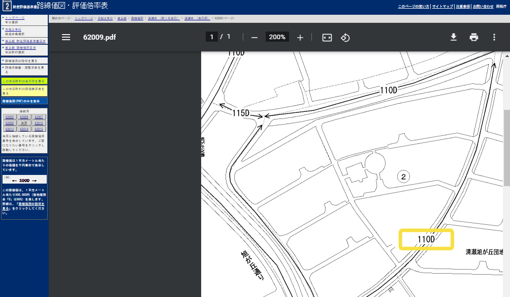 路線価は1㎡あたりの価格が千円単位で記入されています。上記の黄色に囲ってある部分は「110D」なので、1㎡あたりの路線価が110,000円となります。(アルファベットを除いて算出します)