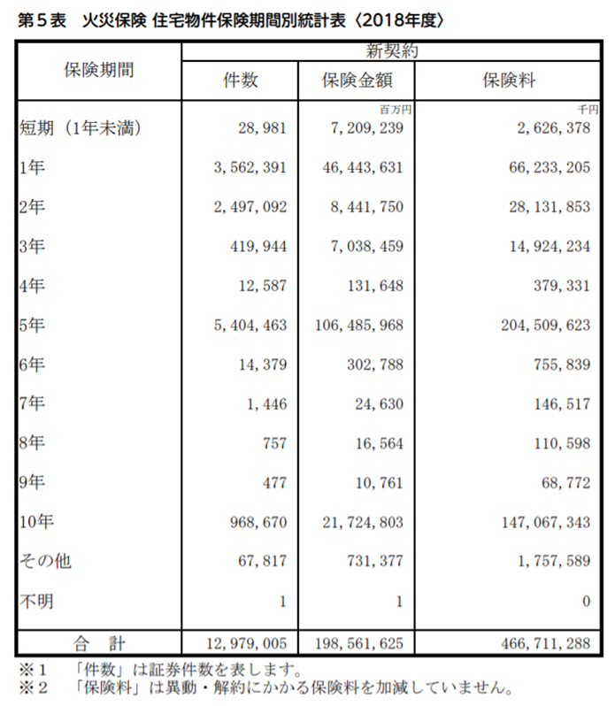 損害保険料率算出機構による「火災保険・地震保険の概況」2019年度版に、保険期間ごとに何件の契約があったかを示す以下のようなデータがあります。