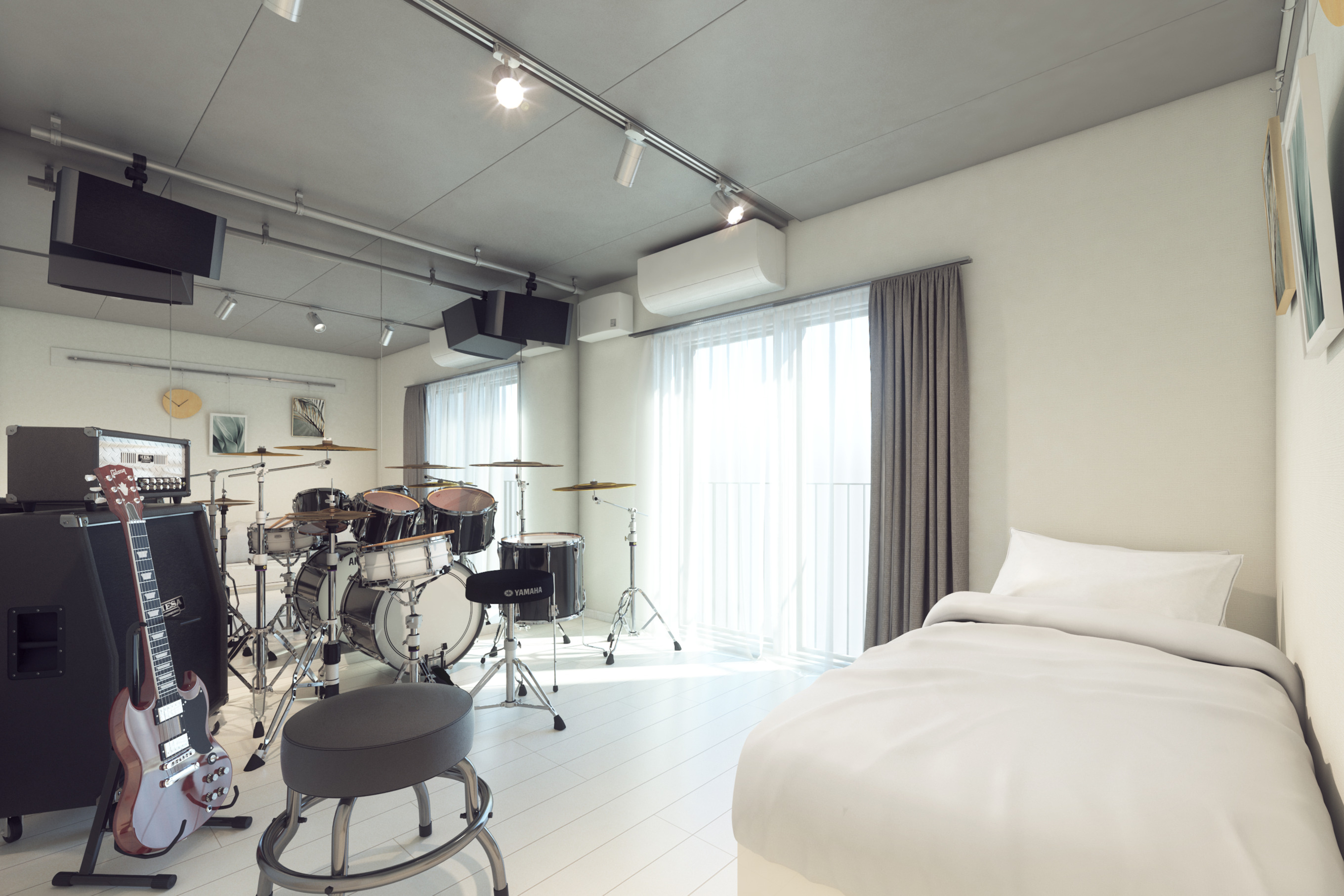 全戸遮音構造の集合住宅において世界最高水準の防音性能である遮音性能 目標値100dB(500Hz)の防音室を完備し、グランドピアノ・ギター・生ドラム・管楽器を 含む全ての楽器の24時間演奏・バンド演奏が可能となります。