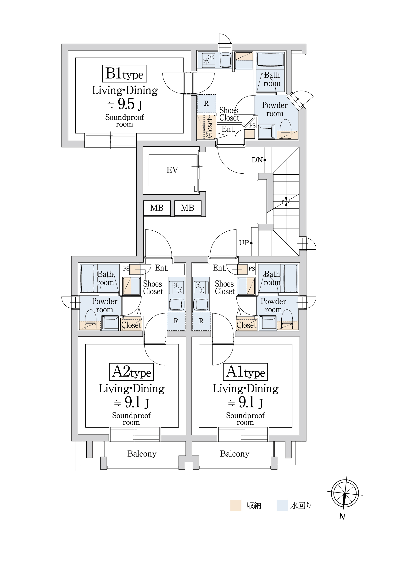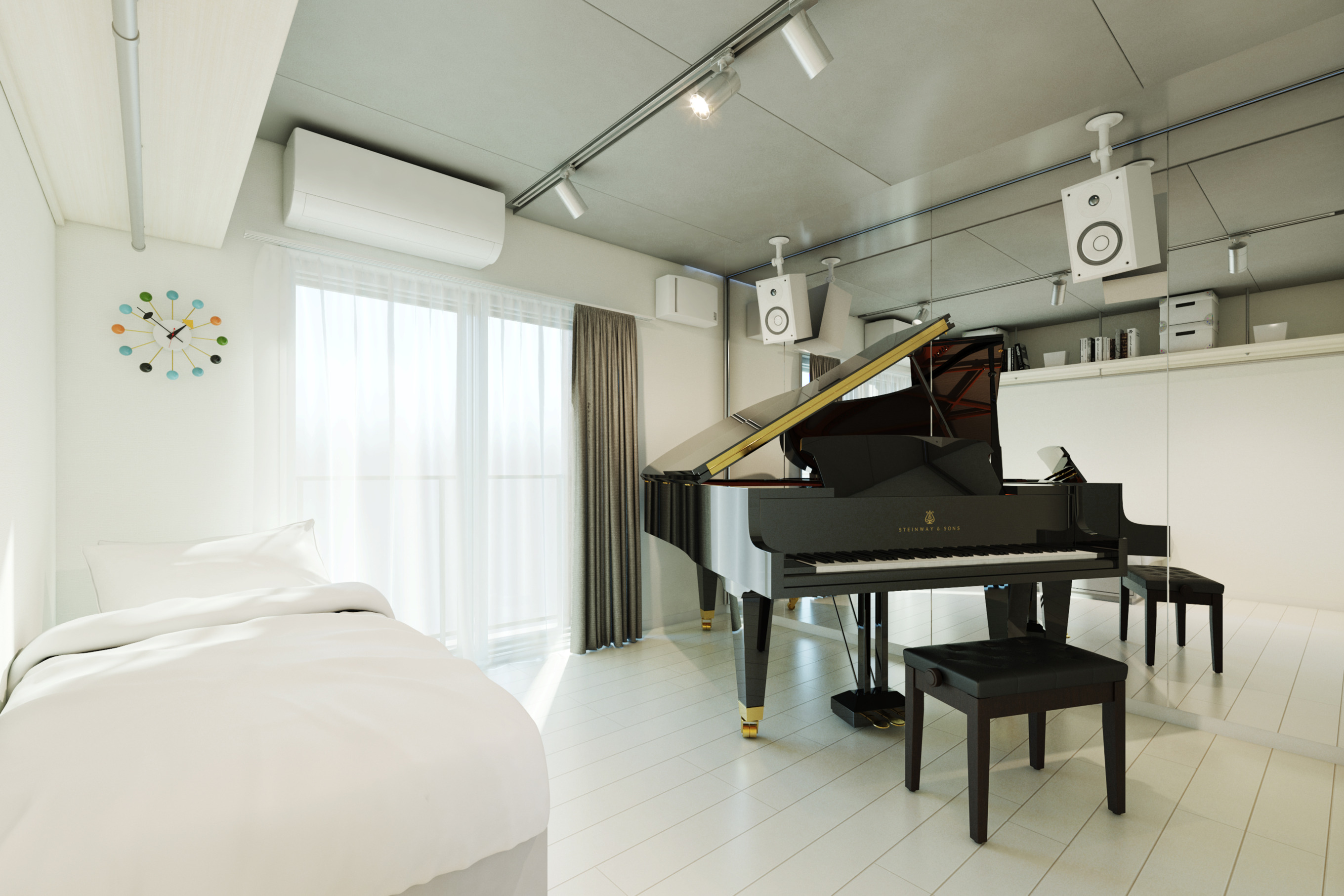全戸遮音構造の集合住宅において世界最高水準の防音性能である遮音性能 目標値100dB(500Hz)の防音室を完備し、グランドピアノ・ギター・生ドラム・管楽器を 含む全ての楽器の24時間演奏・バンド演奏が可能です。