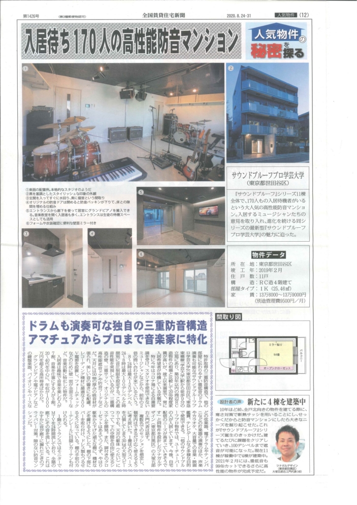全国賃貸住宅新聞8月24日号にサウンドプルーフプロ学芸大学の記事が掲載されました。