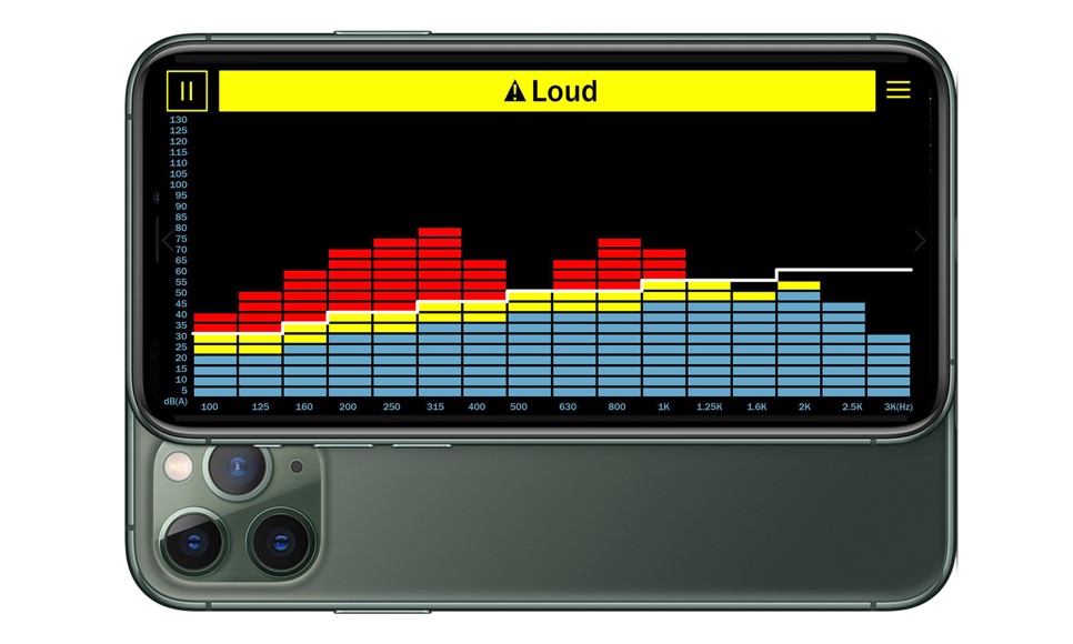 騒音レベルと閾値(しきいち:音漏れしない音圧レベル上限)を周波数帯域ごとにリアルタイムで表示し、隣室や上下階(屋外を除く)へ音漏れが発生しているとアプリが予測感知すると、警告画面表示とバイブレーションによる通知を行います。